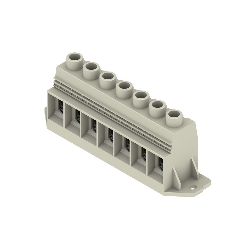 | Kurzbeschreibung | Leiterplattenklemme, 1000 V, 150 A, Raster in mm: 15.00, 50 mm², Polzahl: 7, Zugbügelanschluss, THT-Lötanschluss, 90°, Box |