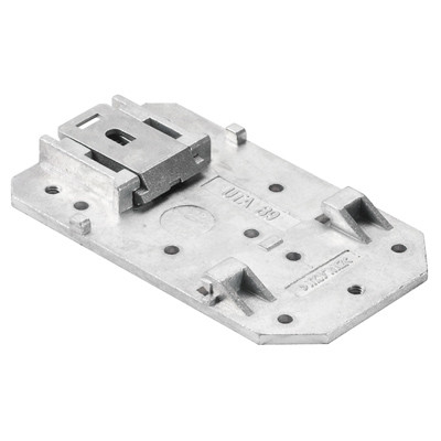 Befestigungselement für Sensor-Aktor-Verteiler und Rundsteckverbinder in Form eines Tragschienenfußes bzw. einer Clip-Halterung.