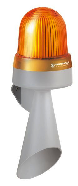 LED-Hupen-Kombi mit langer Lebensdauer und einstellbarer Lautstärke Wartungsfreie, elektronische Hupe mit einer Lebensdauer von bis zu 5.000 h Lautstärke anwendungsspezifisch einstellbar Drei Leuchtbilder fernansteuerbar Licht und Ton getrennt ansteuerbar für eine zweistufige Signalisierung Integrierter Winkel für einfache Wandmontage ohne zusätzliches Zubehör