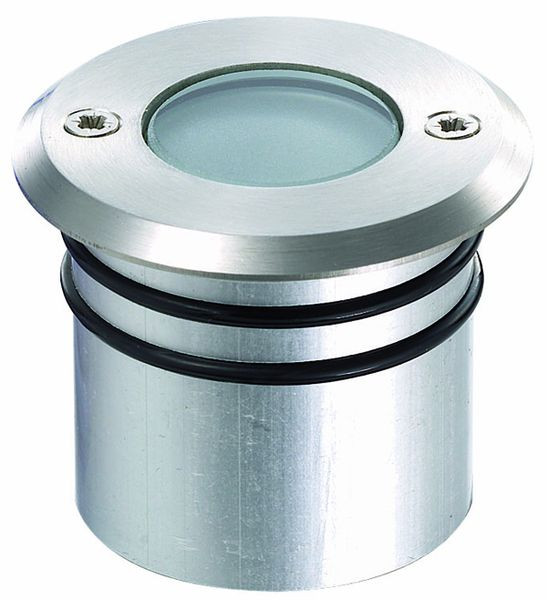 Für Boden- und Wandeinbau, Gehäuse aus eloxiertem Aluminium, mit 1 W POWER-LED, Überrollbelastung 650 kg, extrem kompakte Abmessungen, runde Aufsatzblende, Glasscheibe matt, mehrere Strahler mit separatem Netzteil zu betreiben.