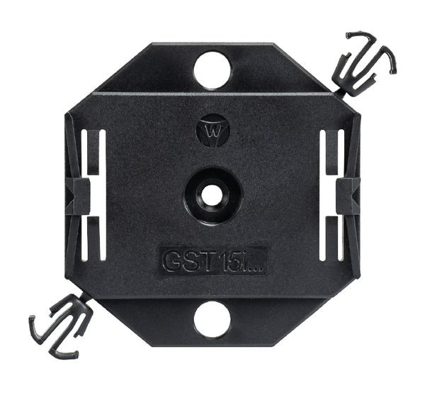 gesis®-Montageplatte für GST15 HH-Verteiler (5 Ausgänge); Zur Befestigung an tragfähigen, geraden Fläche; Befestigung an Kabelrinnen mit den angespritzten Spreiznieten; liegende Verteilermontage; Farbe schwarz