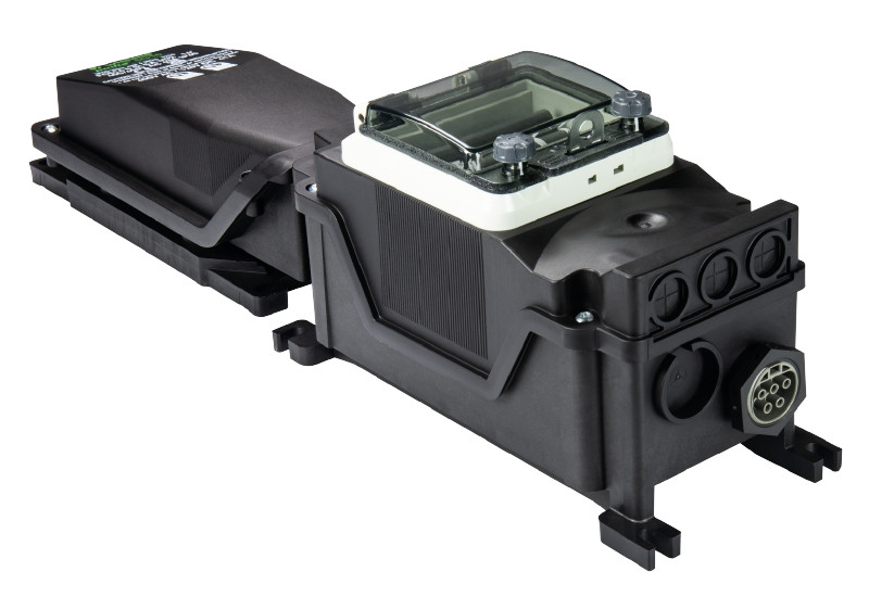 podis CON 5G16 Absicherungsmodul; kombiniert Flachleitungsabgriff und dezentrale Absicherung; intern ist ein 4-poliger Leitungsschutzschalter mit der Auslösecharakteristik C32 A verbaut und verdrahtet; mit einem integrierten steckbaren Ausgang RST25i5 in betongrau; abschließbar mit Vorhängeschloss; Farbe schwarz