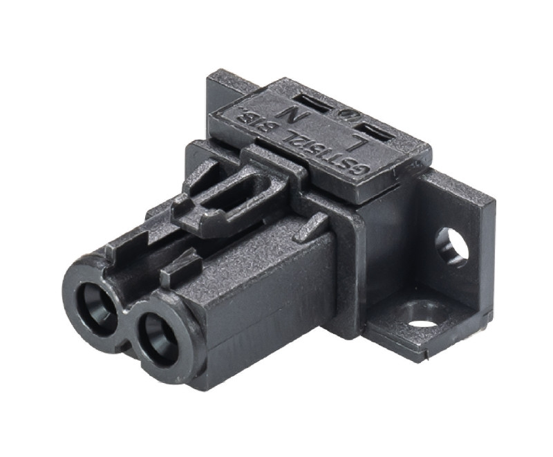 GST15i2 Geräteanschluss, Lötteil, vertikal mit Befestigungsflansch, Polzahl 2, Ausführung Buchse, Anschlussart Lötanschluss, Bemessungsspannung 250 V, Bemessungsstrom 16 A, Codierfarbe / Kontakteinsatz schwarz