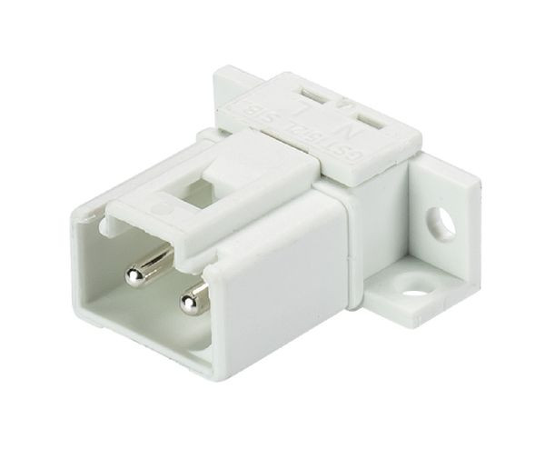 gesis® MINI Geräteanschluss, Lötteil, horizontal mit Befestigungsflansch, Polzahl 2, Ausführung Stecker, Anschlussart Lötanschluss, Bemessungsspannung 250 V, Bemessungsstrom 16 A, Codierfarbe / Kontakteinsatz weiß