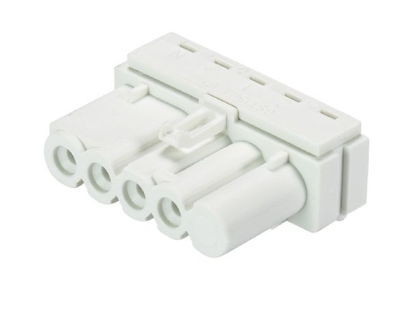 gesis® MINI Geräteanschluss, Lötteil, horizontal ohne Befestigungsflansch, im 5-poligen Gehäuse, Polzahl 4, Ausführung Buchse, Anschlussart Lötanschluss, Bemessungsspannung 250 V / 400 V, Bemessungsstrom 16 A, Codierfarbe / Kontakteinsatz weiß