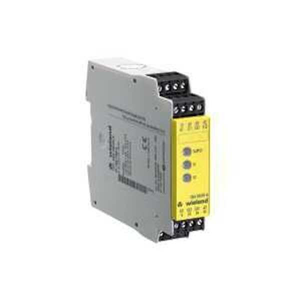 Basisgerät auch für Aufzüge EN 81-20/50 und Brenner EN50156-1, ein- oder zweikanalige Ansteuerung, automatischer Reset ohne Reset-Tast er- Überwachung, Querschlußerkennung, 4 Freigaben, AC 230 V 50-60Hz, Schraubklemme steckbar