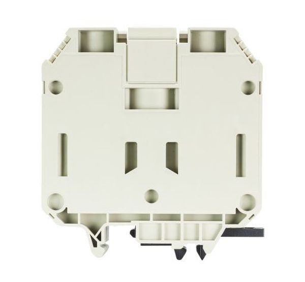 Universalfuß für Tragschiene TS 32 und TS 35, unzerbrechliche Isoliergehäuse aus PA 6.6, dauertemperaturbeständig bis 100 °C, Klemmkörper und Klemmschraube unverlierbar, mit vierstelliger Beschriftungsaufnahme auf 2 Seiten, Klemmen 35 bis 150 mm² in geschlossener Ausführung,