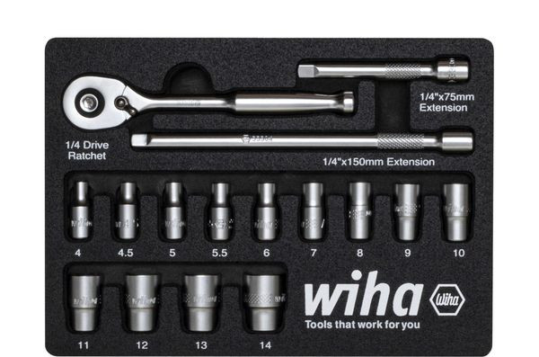 Erhöht Ihre Flexibilität: Rechts-/ Linkslauf durch Umschalthebel variabel einstellbar. Vereinfacht Ihre Arbeit: Mit praktischer Schaumeinlage zur übersichtlichen Aufbewahrung. Steigert Ihre Effizienz: Verschrauben ohne Abzusetzen dank fein verzahntem Ratschenschlüssel. Erfüllt Ihre Ansprüche: Passgenau, robust und leicht zu reinigen. Maße: 197x140x32 mm Anwendung: Für Installations- und Montagearbeiten. Das Anziehen sowie das Öffnen stark festgezogener Sechskantschrauben und -muttern erfordert einen enormen Kraftaufwand. Mit den Steckschlüsseleinsätzen von Wiha bekommt der Anwender jede Verschraubung einfach geöffnet. Mit dem Set aus den 13 gängigsten 1/4Zoll Steckschlüsseleinsätzen in den Größen von 4 - 14 mm, einem Ratschenschlüssel und zwei Verlängerungen ist der Anwender bestens ausgestattet. Der beiliegende Ratschenschlüssel verleiht dem Anwender in Kombination mit der Auswahl an Steckschlüsseln die notwendige Flexibilität im Arbeitseinsatz. Bei Arbeiten mit dem Ratschenschlüssel hat der Anwender dank der Feinverzahnung mit 72 Zähnen einen kurzen Rückholwinkel. Dabei kann der Rechts-/ Linkslauf durch den integrierten Umschalthebel variabel eingestellt werden. In Kombination mit den beiliegenden Verlängerungen können tiefliegende Muttern und Schrauben problemlos erreicht werden. Die Steckschlüssel und Verlängerungen werden mechanisch verriegelt. Der Wechsel erfolgt durch Drücken des Auslöseknopfs. Hergestellt aus hochwertigem Chrom-Vanadium-Stahl stehen die Steckschlüsseleinsätze für Langlebigkeit und Robustheit, nicht zuletzt dank ihrer korrosionsbeständigen und leicht zu reinigenden Oberfläche. Der gesamte Set Inhalt ist geordnet und übersichtlich in einer Schaumstoffeinlage aufbewahrt, in welcher das schnelle Finden des passenden Steckschlüssels durch Kennzeichnungen unterstützt wird.Dabei verhilft die griffige Oberfläche, zu starkem Halt selbst in öligen oder nassen Arbeitssituationen. in Anlehnung an DIN 3120 / 3122 / 3124 Inhalt: 1x Ratschenschlüssel für Steckschlüssel 1/4" umschaltbar 128 mm (44666) 1x Steckschlüsseleinsatz 1/4" Außensechskant 4,0 mm x 25 mm (44669) 1x Steckschlüsseleinsatz 1/4" Außensechskant 4,5 mm x 25 mm (44677) 1x Steckschlüsseleinsatz 1/4" Außensechskant 5,0 mm x 25 mm (44670) 1x Steckschlüsseleinsatz 1/4" Außensechskant 5,5 mm x 25 mm (44671) 1x Steckschlüsseleinsatz 1/4" Außensechskant 6,0 mm x 25 mm (44672) 1x Steckschlüsseleinsatz 1/4" Außensechskant 7,0 mm x 25 mm (44673) 1x Steckschlüsseleinsatz 1/4" Außensechskant 8,0 mm x 25 mm (44674) 1x Steckschlüsseleinsatz 1/4" Außensechskant 9,0 mm x 25 mm (44675) 1x Steckschlüsseleinsatz 1/4" Außensechskant 10,0 mm x 25 mm (44676) 1x Steckschlüsseleinsatz 1/4" Außensechskant 11,0 mm x 25 mm (44678) 1x Steckschlüsseleinsatz 1/4" Außensechskant 12,0 mm x 25 mm (44679) 1x Steckschlüsseleinsatz 1/4" Außensechskant 13,0 mm x 25 mm (44680) 1x Steckschlüsseleinsatz 1/4" Außensechskant 14,0 mm x 25 mm (44681) 1x Verlängerung 1/4" für Steckschlüsseleinsätze 75 mm (44667) 1x Verlängerung 1/4" für Steckschlüsseleinsätze 150 mm (44668) 1x Schaumstoffeinlage