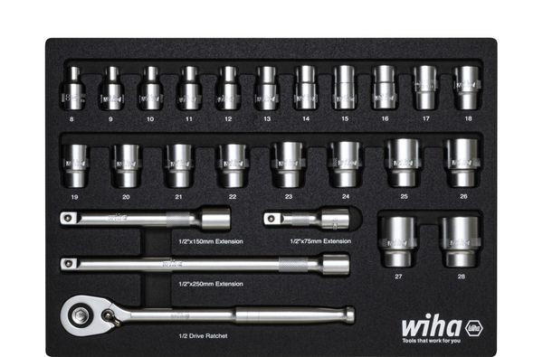 Erhöht Ihre Flexibilität: Rechts-/ Linkslauf durch Umschalthebel variabel einstellbar. Vereinfacht Ihre Arbeit: Mit praktischer Schaumeinlage zur übersichtlichen Aufbewahrung. Steigert Ihre Effizienz: Verschrauben ohne Abzusetzen dank fein verzahntem Ratschenschlüssel. Erfüllt Ihre Ansprüche: Passgenau, robust und leicht zu reinigen. Maße: 395x280x32 mm Anwendung: Für Installations- und Montagearbeiten. Das Anziehen sowie das Öffnen stark festgezogener Sechskantschrauben und -muttern erfordert einen enormen Kraftaufwand. Mit den Steckschlüsseleinsätzen von Wiha bekommt der Anwender jede Verschraubung einfach geöffnet. Mit dem Set aus den 21 gängigsten 1/2Zoll Steckschlüsseleinsätzen in den Größen von 8 - 28 mm, einem Ratschenschlüssel und drei Verlängerungen ist der Anwender bestens ausgestattet. Der beiliegende Ratschenschlüssel verleiht dem Anwender in Kombination mit der Auswahl an Steckschlüsseln die notwendige Flexibilität im Arbeitseinsatz. Bei Arbeiten mit dem Ratschenschlüssel hat der Anwender dank der Feinverzahnung mit 72 Zähnen einen kurzen Rückholwinkel. Dabei kann der Rechts-/ Linkslauf durch den integrierten Umschalthebel variabel eingestellt werden. In Kombination mit den beiliegenden Verlängerungen können tiefliegende Muttern und Schrauben problemlos erreicht werden. Die Steckschlüssel und Verlängerungen werden mechanisch verriegelt. Der Wechsel erfolgt durch Drücken des Auslöseknopfs. Hergestellt aus hochwertigem Chrom-Vanadium-Stahl stehen die Steckschlüsseleinsätze für Langlebigkeit und Robustheit, nicht zuletzt dank ihrer korrosionsbeständigen und leicht zu reinigenden Oberfläche. Der gesamte Set Inhalt ist geordnet und übersichtlich in einer Schaumstoffeinlage aufbewahrt, in welcher das schnelle Finden des passenden Steckschlüssels durch Kennzeichnungen unterstützt wird. in Anlehnung an DIN 3120 / 3122 / 3124 Inhalt: 1x 1/2" x 257 mm (44709) 1x Steckschlüsseleinsatz 1/2" Doppel-Sechskant 8,0 mm x 38 mm (44713) 1x Steckschlüsseleinsatz 1/2" Doppel-Sechskant 9,0 mm x 38 mm (44714) 1x Steckschlüsseleinsatz 1/2" Doppel-Sechskant 10,0 mm x 38 mm (44715) 1x Steckschlüsseleinsatz 1/2" Doppel-Sechskant 11,0 mm x 38 mm (44716) 1x Steckschlüsseleinsatz 1/2" Doppel-Sechskant 12,0 mm x 38 mm (44717) 1x Steckschlüsseleinsatz 1/2" Doppel-Sechskant 13,0 mm x 38 mm (44718) 1x Steckschlüsseleinsatz 1/2" Doppel-Sechskant 14,0 mm x 38 mm (44719) 1x Steckschlüsseleinsatz 1/2" Doppel-Sechskant 15,0 mm x 38 mm (44720) 1x Steckschlüsseleinsatz 1/2" Doppel-Sechskant 16,0 mm x 38 mm (44721) 1x Steckschlüsseleinsatz 1/2" Doppel-Sechskant 17,0 mm x 38 mm (44722) 1x Steckschlüsseleinsatz 1/2" Doppel-Sechskant 18,0 mm x 38 mm (44723) 1x Steckschlüsseleinsatz 1/2" Doppel-Sechskant 19,0 mm x 38 mm (44724) 1x Steckschlüsseleinsatz 1/2" Doppel-Sechskant 20,0 mm x 38 mm (44725) 1x Steckschlüsseleinsatz 1/2" Doppel-Sechskant 21,0 mm x 38 mm (44726) 1x Steckschlüsseleinsatz 1/2" Doppel-Sechskant 22,0 mm x 38 mm (44727) 1x Steckschlüsseleinsatz 1/2" Doppel-Sechskant 23,0 mm x 40 mm (44728) 1x Steckschlüsseleinsatz 1/2" Doppel-Sechskant 24,0 mm x 40 mm (44729) 1x Steckschlüsseleinsatz 1/2" Doppel-Sechskant 25,0 mm x 42 mm (44730) 1x Steckschlüsseleinsatz 1/2" Doppel-Sechskant 26,0 mm x 42 mm (44731) 1x Steckschlüsseleinsatz 1/2" Doppel-Sechskant 27,0 mm x 44 mm (44732) 1x Steckschlüsseleinsatz 1/2" Doppel-Sechskant 28,0 mm x 44 mm (44733) 1x Verlängerung 1/2" für Steckschlüsseleinsätze 75 mm (44710) 1x Verlängerung 1/2" für Steckschlüsseleinsätze 150 mm (44711) 1x Verlängerung 1/2" für Steckschlüsseleinsätze 250 mm (44712) 1x Schaumstoffeinlage