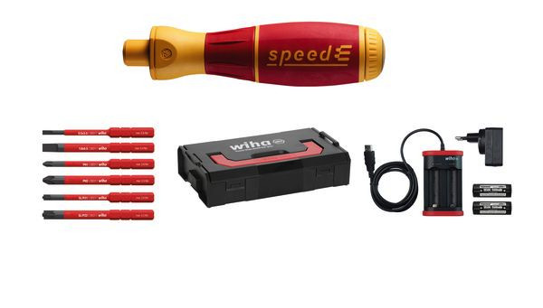 Steigert Ihre Geschwindigkeit: 2x schnelleres Arbeiten dank 3-Stufen Prozess. Schont Ihre Gesundheit: Empfohlen von Ärzten und Therapeuten des AGR. Steigert Ihre Kontrolle: Manuelle Fixierung mit vollem Gefühl. Schützt Ihr Material: Elektrisches Verschrauben mit Schutzfunktion zur Vermeidung von Materialbeschädigungen (max. 0,4 Nm). Bietet Ihnen vollen Schutz: slimBits bei 10.000 V AC getestet und zugelassen für 1.000 V AC. Anwendung: Ideales Werkzeug für alle Schraubarbeiten, z.B. Steckdosenmontage, Arbeiten im Schaltschrank, Industriewartung und -montage, Wartung und Reparatur von Motorgeräten, Haushaltsgeräte und weiße Ware, Fenster- und Türenmontage, Heizung-, Klima- und Sanitärinstallationen und Reparatur von Fahrrad, Motorrad und Rasenmäher. Auch im Haushalt für Möbelaufbauten, Reparaturen und sonstige Schraubaufgaben im Hobbybereich perfekt geeignet. Wer täglich viele Verschraubungen durchführt, weiß genau, welchen Zeitaufwand es kostet und wie stark die Handgelenke auf Dauer belastet werden. Mit dem weltweit ersten E-Schraubendreher speedE® von Wiha gehören diese Probleme mit einem Mal der Vergangenheit an! Mit dem speedE® schraubt man mindestens 2 x so schnell wie mit einem herkömmlichen Schraubendreher und hat dank der Materialschutzfunktion dennoch die volle Kontrolle über die Anzugskraft. Bei 0,4 Nm schaltet die elektrische Unterstützung zum Schutz des Materials automatisch aus und der finale, manuelle Schraubenanzug kann gefühlvoll von Hand erfolgen. Durch die elektrische Ratschenfunktion und die prämierte SoftFinish Griffform reduziert der speedE® spürbar die Belastung der Muskeln, Sehnen und Gelenke und wird aus diesem Grund von Ärzten und Physiotherapeuten des AGR empfohlen. Das integrierte LED-Licht beleuchtet zielgenau die Schraube und das Werkstück, an dem gearbeitet wird. Effizienz im Alltag bringt der E-Schraubendreher insbesondere dank seiner kleinen kompakten Form. Mit den enthaltenen Standard-Akkus des Typs 18500 können pro Ladung mindestens 800 Verschraubungen vorgenommen werden. In Kombination mit den wechselbaren Wiha slimBits kann er zudem für eine Vielzahl von unterschiedlichen Schraubprofilen eingesetzt werden. In Kombination mit den VDE zertifizierten slimBits bietet der speedE® Elektrikern vollen Schutz bei ihren täglichen Arbeiten. Inhalt: 1x L-Boxx mini 1x E-Schraubendreher Griff speedE® 1x Akku-Set 18500 Li-Ion 2 Stk. in Box (41914) 1x Ladegerät für Akku Typ 18500 Li-Ion mit USB und Eurostecker (41915) 1x Bit slimBit electric Schlitz 3,5 mm (41159) 1x Bit slimBit electric Schlitz 5,5 mm (34581) 1x Bit slimBit electric Phillips PH1 (34583) 1x Bit slimBit electric Phillips PH2 (34584) 1x Bit slimBit electric Pozidriv PZ1 (34585) 1x Bit slimBit electric Pozidriv PZ2 (34586) 1x Bit slimBit electric PlusMinus/Pozidriv SL/PZ1 (34589) 1x Bit slimBit electric PlusMinus/Pozidriv SL/PZ2 (34590) 1x Bit slimBit electric innensechsrund T10 (35507) 1x Bit slimBit electric innensechsrund T15 (35508) 1x Bit slimBit electric innensechsrund T20 (35509) 1x Bit slimBit electric innensechsrund T25 (36071) 1x Bit slimBit electric Sechskant 3 mm (37147) 1x Universalschlüssel mit Doppelgelenk für Außendreikant, Außenvierkant und Doppelbart 7-9- 5 - 8- 3 - 5 (44001) 1x Bit slimBit electric Sechskant 5 mm (37226) 1x Bit slimBit electric Sechskant 6 mm (37227) 1x Drehmoment easyTorque Adapter electric für slimBits und slimVario® Halter in Blister 0,8 Nm ± 10 % ± 59 mm (41341) 1x Drehmoment easyTorque Adapter electric für slimBits und slimVario® Halter in Blister 2 Nm ± 10 % ± 59 mm (41342) 1x Drehmoment easyTorque Adapter electric für slimBits und slimVario® Halter in Blister 2,5 Nm ± 10 % ± 59 mm (41343) 1x Drehmoment easyTorque Adapter electric für slimBits und slimVario® Halter in Blister 2,8 Nm ± 10 % ± 59 mm (41344) 1x Drehmoment easyTorque Adapter electric für slimBits und slimVario® Halter in Blister 4 Nm ± 10 % ± 59 mm (41345)