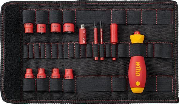 Vereinfacht Ihre Arbeit: Alle Werkzeuge sicher und geordnet in einer robusten und übersichtlichen Tasche untergebracht. Schützt Ihr Material: Vollisolierte Steckschlüssel reduzieren die Gefahr von Kurzschlüssen. Bietet Ihnen vollen Schutz: Jedes Werkzeug einzeln bei 10.000 V AC getestet und zugelassen für 1.000 V AC. Erhöht Ihre Sicherheit: Wiha slimBits gewährleisten einen guten und geschützten Zugang zu tief liegenden Schrauben. Bithalter: Isolierter Bithalter aus Metall hält alle slimBits zuverlässig. Bithalter: Nur für 6 mm slimBits. Bei Arbeiten an unterschiedlichen Einsatzorten wie z.B. an Schaltschränken und elektrischen Anlagen werden viele verschiedene Schraubprofile benötigt. Das 13-tlg. Set deckt mit seiner Auswahl an Steckschlüsseleinsätzen und den beiden slimBits die gängigsten Verschraubungen ab und ist somit flexibel einsetzbar. Sicher verstaut und geordnet in einer robusten Falttasche sind die Elektriker-Werkzeuge perfekt für den mobilen Einsatz geeignet. Dank der Wiha slimTechnology können die enthaltenen slimBits mit ihrer bis zu 33% schlankeren Klingen auch tiefliegende Schraub- und Federelemente mühelos erreichen. Die 1/4Zoll Steckschlüsseleinsätze können in Kombination mit speedE® und slimVario® Handgriffen für das Anziehen und Lösen von Sechskant-Schrauben verwendet werden. Gerade im beengten Arbeitsumfeld verhindern die vollisolierten Werkzeuge bei unabsichtlichem Kontaktieren zweier Leiter einen Kurzschluss. Jedes Werkzeug im Set wurde gemäß der internationalen Norm IEC 60900 einer Stückprüfung unterzogen und ermöglicht ein sicheres Arbeiten im Bereich von spannungsführenden Teilen bis 1.000 V AC. Geprüft gemäß IEC 60900. Inhalt: 1x Schraubendreher mit Bithalter SoftFinish® slimVario® electric 1x Verlängerung slimVario® electric für slimBits 6,0 mm x 69,5 mm (43292) 1x Adapter slimVario® electric für 1/4" Steckschlüssel 59 mm (43139) 1x Bit slimBit electric Schlitz 3,5 mm x 75 mm (41159) 1x Bit slimBit electric Schlitz 5,5 mm x 75 mm (34581) 1x Steckschlüsseleinsatz isoliert 1/4" Außensechskant 5,0 mm x 42 mm (43089) 1x Steckschlüsseleinsatz isoliert 1/4" Außensechskant 5,5 mm x 42 mm (43090) 1x Steckschlüsseleinsatz isoliert 1/4" Außensechskant 6,0 mm x 42 mm (43091) 1x Steckschlüsseleinsatz isoliert 1/4" Außensechskant 7,0 mm x 42 mm (43092) 1x Steckschlüsseleinsatz isoliert 1/4" Außensechskant 8,0 mm x 42 mm (43093) 1x Steckschlüsseleinsatz isoliert 1/4" Außensechskant 10,0 mm x 42 mm (43095) 1x Steckschlüsseleinsatz isoliert 1/4" Außensechskant 11,0 mm x 42 mm (43096) 1x Steckschlüsseleinsatz isoliert 1/4" Außensechskant 13,0 mm x 42 mm (43098) 1x Falttasche