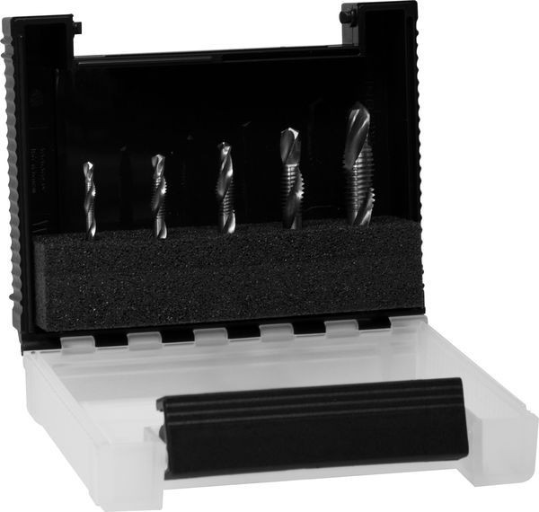 Extra: In Kunststoff-Box. DIN 3126, ISO 1173, Form C6,3 Inhalt: 1x Kombigewindebohrer-Bit 1/4" M3 x 36 mm (27897) 1x Kombigewindebohrer-Bit 1/4" M4 x 39 mm (27898) 1x Kombigewindebohrer-Bit 1/4" M5 x 41 mm (27899) 1x Kombigewindebohrer-Bit 1/4" M6 x 44 mm (27900) 1x Kombigewindebohrer-Bit 1/4" M8 x 51 mm (27901) 1x Box