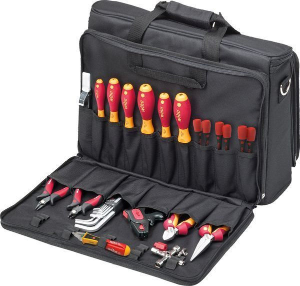 Erfüllt Ihre Ansprüche: Ausgewählte Bestückung für die gängigsten Anwendungsfälle. Erhöht Ihre Sicherheit: Wiha slim Klingen gewährleisten guten und geschützten Zugang zu tief liegenden Schrauben. Erhöht Ihre Sicherheit: International ausgezeichnete VDE isolierte Werkzeuge, einzeln bei 10.000 V AC getestet und zugelassen für 1.000 V AC. Steigert Ihre Effizienz: Platzsparende Werkzeugtasche vom Komplettset abnehmbar und separat nutzbar. Anwendung: Grundausstattung für den Service-Techniker. Anwendung: Geeignet für die elektrische und elektronische Wartung von Maschinen und Komponenten. Anwendung: Für Arbeiten im Bereich von spannungsführenden Teilen bis 1.000 V AC. Ausfuehrung: Kombinierte Laptop-/ Werkzeug-Tasche, ideal für den Service-Techniker. Ausfuehrung: Vollständig aufklappbar mit Reißverschluss. Ausfuehrung: Mehrere Einsteckfächer für Handwerkzeuge, Laptop und Dokumente. Ausfuehrung: Ausreichend Platz für individuelle Zusatzbestückungen. Ausfuehrung: Werkzeugseitentasche durch Reißverschluss entnehm- und separat nutzbar. Ausfuehrung: Laptop-Tasche geeignet für alle gängigen Laptops. Ausfuehrung: Taschenformat ca. 47x35x22 cm. Ausfuehrung: Gewicht 5000 g. Inhalt: 1x Schraubendreher SoftFinish® electric slimFix Schlitz 3,5 mm x 100 mm (35446) 1x Schraubendreher SoftFinish® electric slimFix Schlitz 5,5 mm x 125 mm (35391) 1x Schraubendreher SoftFinish® electric slimFix Phillips PH1 x 80 mm (35393) 1x Schraubendreher SoftFinish® electric slimFix Phillips PH2 x 100 mm (35394) 1x Schraubendreher SoftFinish® electric slimFix Pozidriv PZ1 x 80 mm (35395) 1x Schraubendreher SoftFinish® electric slimFix Pozidriv PZ2 x 100 mm (35396) 1x Feinschraubendreher PicoFinish® Schlitz 1,5 mm x 40 mm (42384) 1x Feinschraubendreher PicoFinish® Schlitz 2,0 mm x 40 mm (42388) 1x Feinschraubendreher PicoFinish® Schlitz 2,5 mm x 50 mm (42391) 1x Feinschraubendreher PicoFinish® Schlitz 3,0 mm x 50 mm (42394) 1x Feinschraubendreher PicoFinish® Phillips PH00 x 40 mm (42402) 1x Feinschraubendreher PicoFinish® Phillips PH0 x 50 mm (42401) 1x Schaltschrankschlüssel Kreuz-Form 7,0 mm- 9- 5 - 8- 3 - 5 (36114) 1x Stiftschlüssel Set im Compact Halter Sechskant-Kugelkopf 9-tlg. mattverchromt (01418) 1x Seitenschneider Professional electric mit DynamicJoint® 160 mm, 6 1/2" (43335) 1x Flachrundzange Professional electric mit Schneide gerade Form 200 mm, 8" (26727) 1x Spitzzange Electronic schmaler, kurzer Kopf gerade Form 135 mm, 5 1/3" (26801) 1x Seitenschneider Electronic breiter, spitzer Kopf und Drahthaltefeder ohne Wate 130 mm, 5 1/8" (26825) 1x Abisolierwerkzeug automatisch bis 6 mm² 190 mm, 7 1/2" (44617) 1x Abmantelungswerkzeug mit selbstdrehender Schleppklinge für Rundkabel 165 mm (44618) 1x Spannungsprüfer SoftFinish® einpolig, 110 - 250 Volt Schlitz transparent, mit Ansteckclip 3,0 mm (34745) 1x Werkzeugtasche (Mechaniker/Elektriker)