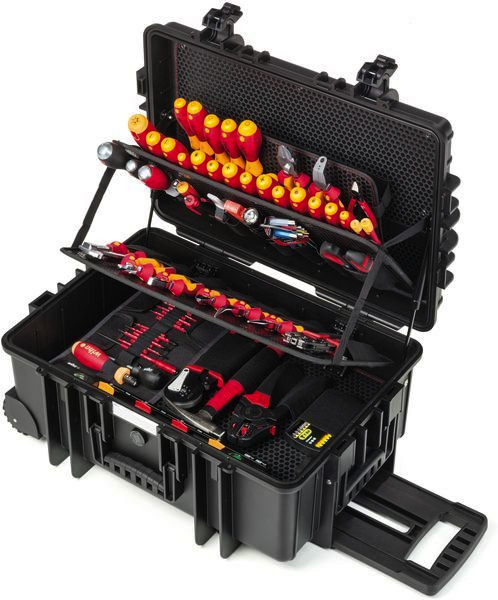 Herkömmliche Werkzeugkoffer sind oft nicht robust genug, haben wenig Stauraum und die Werkzeuge sind schwer zugänglich. Diese Mängel wurden bei der Entwicklung des 115-teiligen Elektriker Competence XXL II Koffers von Wiha ein für alle Mal beseitigt. Die Werkzeugeinlagen dieses Koffers sind mit Blick auf eine effiziente Arbeitsweise so konzipiert, dass alle Werkzeuge schnell und einfach entnehmbar sind. Durch die umfangreiche Ausstattung haben Elektriker für jede Anwendung das passende Utensil parat, wie zum Beispiel den Magazin Bithalter LiftUp electric, ein Drehmoment-Schraubendreher Set, vollisolierte Schraubendreher aus der Wiha Slim Familie oder die Installationszange TriCut. Im großen Stauraum des Werkzeugkoffers ist zudem eine speziell auf Elektrikeranwendungen ausgelegte Wasserwaage enthalten. Der aus robustem Polypropylen Kunststoff bestehende Koffer ist zusätzlich mit Gasdruckdämpfern ausgestattet, die den Deckel in verschiedenen Positionen halten und verhindern, dass er automatisch zufällt und Verletzungen vermeidet.Inhalte:1 x Abisolierwerkzeug automatisch bis 16 mm² in Blister (42062) 200 mm, 1 x Abmantelungswerkzeug mit selbstdrehender Schleppklinge (35969) 165 mm, 1 x Bit Set XLSelector Y-Bit 25 mm Phillips, Pozidriv, innensechsrund 31-tlg. 1/4" (41832), 1 x Bit slimBit electric Pozidriv (34586) PZ2 x 75 mm, 1 x Crimpwerkzeug automatisch für Aderendhülsen Sechskant-Pressung (41246) 210 mm, 1 x Crimpwerkzeug für isolierte Kabelschuhe und Kontakte (33841) 220 mm, 1 x Drehmoment-Schraubendreher Set TorqueVario®-S electric gemischt 18-tlg. variabel einstellbare Drehmomentbegrenzung in Tasche (36791) 0,8-5,0 Nm, 1 x Dübellochschläger Set SoftFinish® mit Dübeln Phillips mit 6 mm Rundklinge in Blister 5-tlg. (41289), 1 x Elektriker Gliedermaßstab Longlife® 2 m metrisch, 10 Glieder (42068) orange, 1 x Elektriker Hammer mit 300 g Hammerkopf, in Blister (42071), 1 x Elektriker Wasserwaage 40 cm (42074), 1 x Elektrikerschere mit Crimpfunktion in Blister (41923) 160 mm, 1 x Feinmechaniker-Seitenschneider Classic mit Öffnungsfeder (36189) 125 mm, 1 x Feinschraubendreher PicoFinish electric Phillips (38880) PH0 x 60 mm, 1 x Feinschraubendreher PicoFinish electric Schlitz (38876) 2,5 mm x 60 mm, 1 x Flachrundzange Professional electric mit Schneide gebogene Form, ca. 40° (26729) 200 mm, 1 x Flachrundzange Professional electric mit Schneide gerade Form (26727) 200 mm, 1 x Hochleistungs-Seitenschneider BiCut® Professional mit DynamicJoint® umschaltbar (38191) 200 mm, 1 x Installationszange TriCut Professional electric (38552) 170 mm, 1 x Kabelschneider Professional electric (34744) 200 mm, 1 x Kombizange Professional electric mit DynamicJoint® und OptiGrip mit extra langer Schneide (26708) 180 mm, 1 x Schaltschrankschlüssel Stift-Form in Blister (39076), 1 x Schraubendreher mit Bit Magazin LiftUp electric Schlitz, Pozidriv, PlusMinus/Pozidriv mit 6 slimBits (41234), 1 x Schraubendreher mit Bithalter SoftFinish® electric slimVario Stubby für slimBits (41229) 6, 1 x Schraubendreher SoftFinish® electric Sechskant-Steckschlüssel (00856) 5,5 mm x 125 mm, 1 x Schraubendreher SoftFinish® electric Sechskant-Steckschlüssel (00858) 7 mm x 125 mm, 1 x Schraubendreher SoftFinish® electric Sechskant-Steckschlüssel (00859) 8 mm x 125 mm, 1 x Schraubendreher SoftFinish® electric Sechskant-Steckschlüssel (00861) 10 mm x 125 mm, 1 x Schraubendreher SoftFinish® electric Sechskant-Steckschlüssel (00864) 13 mm x 125 mm, 1 x Schraubendreher SoftFinish® electric slimFix Phillips (35393) PH1 x 80 mm, 1 x Schraubendreher SoftFinish® electric slimFix Phillips (35394) PH2 x 100 mm, 1 x Schraubendreher SoftFinish® electric slimFix PlusMinus/Pozidriv (36329) SL/PZ1 x 80 mm, 1 x Schraubendreher SoftFinish® electric slimFix PlusMinus/Pozidriv (36330) SL/PZ2 x 100 mm, 1 x Schraubendreher SoftFinish® electric slimFix Pozidriv (35395) PZ1 x 80 mm, 1 x Schraubendreher SoftFinish® electric slimFix Pozidriv (35396) PZ2 x 100 mm, 1 x Schraubendreher SoftFinish® electric slimFix Schlitz (35391) 5,5 mm x 125 mm, 1 x Schraubendreher SoftFinish® electric slimFix Schlitz (35392) 6,5 mm x 150 mm, 1 x Schraubendreher SoftFinish® electric slimFix Schlitz (35446) 3,5 mm x 100 mm, 1 x Schraubendreher SoftFinish® electric slimFix innensechsrund Tamper Resistant (mit Bohrung) (41141) T10H x 100 mm, 1 x Schraubendreher SoftFinish® electric slimFix innensechsrund Tamper Resistant (mit Bohrung) (41142) T15H x 100 mm, 1 x Schraubendreher SoftFinish® electric slimFix innensechsrund Tamper Resistant (mit Bohrung) (41143) T20H x 100 mm, 1 x Schraubendreher SoftFinish® electric slimFix innensechsrund Tamper Resistant (mit Bohrung) (41144) T25H x 125 mm, 1 x Schraubendreher SoftFinish® Schlitz mit durchgehender Sechskantklinge und massiver Stahlkappe (03223) 3,5 mm x 75 mm, 1 x Schraubendreher SoftFinish® Schlitz mit durchgehender Sechskantklinge und massiver Stahlkappe (03231) 12,0 mm x 200 mm, 1 x Seitenschneider Professional electric mit DynamicJoint® (26741) 160 mm, 1 x Spannungsprüfer SoftFinish® einpolig, 110 - 250 Volt (34745) 3,0 mm x 60 mm, 1 x Spannungsprüfer Volt Detector berührungslos, einpolig, 230-1.000 V AC (37871), 1 x Stiftschlüssel Set im ErgoStar Halter Sechskant-Kugelkopf MagicRing® 9-tlg. farbig leuchtend (41979), 1 x Taschenlampe mit LED, Laser und UV Licht in Blister inkl. 3x AAA-Batterien (41286), 1 x Wasserpumpenzange Professional electric mit Druckknopfeinstellung (37450) 250 mm