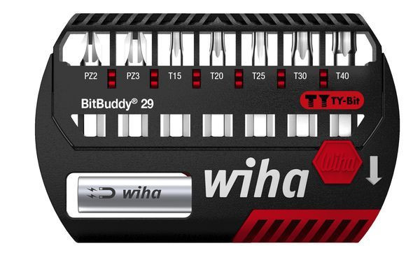 Steigert Ihre Effizienz: Der Generalist mit 120x höherer Lebensdauer* dank patentierter Bittechnologie, geeignet für alle Schrauben. (*im Vergleich zu Wiha Standardbit) Senkt Ihre Kosten: Bit dank roter Farbmarkierung schnell und einfach auffindbar – mit UV-Licht sogar in dunkler Umgebung. Spart Zeit: Automatische Öffnung auf Knopfdruck und einfacher Bitwechsel direkt im Halter. Spart Zeit: Kein langes Suchen dank leuchtend farbigem Bit, geringe Bitwechselzeit dank hoher Lebensdauer. Anwendung: Für alle Arten von Schrauben geeignet. Auch für Impact- und Schlagschrauber geeignet. Keine Hand frei und das lästige Suchen nach dem richtigen Bit satt? Der Wiha BitBuddy® ermöglicht die direkte Aufnahme der Bits in der Maschine sowie das einfache Zurückführen in den Halter. Der im Set enthaltene Bithalter mit starkem Magnet unterstützt die innovative Handhabung des Buddies mit nur einer Hand. Dank der neuartigen Anordnung der Bits in der Halterung sowie der gelaserten Profilgröße auf dem Bitboden wird die Auswahl der richtigen Größe bei der Bitentnahme zum Kinderspiel. Der enthaltene TY-Bit ist als Multitalent für alle Arten von Schrauben, sowohl für T-förmige als auch Y-förmige Schrauben, geeignet und somit das ideale Werkzeug für Verschraubungen in allen Materialen. Dank der patentierten, verlängerten Torsionszone ist der Bit auch für Impact- und Schlagschrauber geeignet und garantiert eine 120x höhere Lebensdauer im Vergleich zu den Wiha Standardbits. Zudem sind die farbigen Bits schnell und einfach auffindbar und dank des Farbmantels auch im Dunkeln mit UV-Licht gut zu finden. DIN 3126, ISO 1173, Form C6,3 Inhalt: 1x TY-Bit 29 mm Pozidriv 1/4 PZ2 1x TY-Bit 29 mm Pozidriv 1/4 PZ3 1x TY-Bit 29 mm innensechsrund 1/4 T15 1x TY-Bit 29 mm innensechsrund 1/4 T20 1x TY-Bit 29 mm innensechsrund 1/4 T25 1x TY-Bit 29 mm innensechsrund 1/4 T30 1x TY-Bit 29 mm innensechsrund 1/4 T40 1x Bithalter magnetisch 60 mm 1/4 extra starker Magnet in Box (41922) 1x BitBuddy®