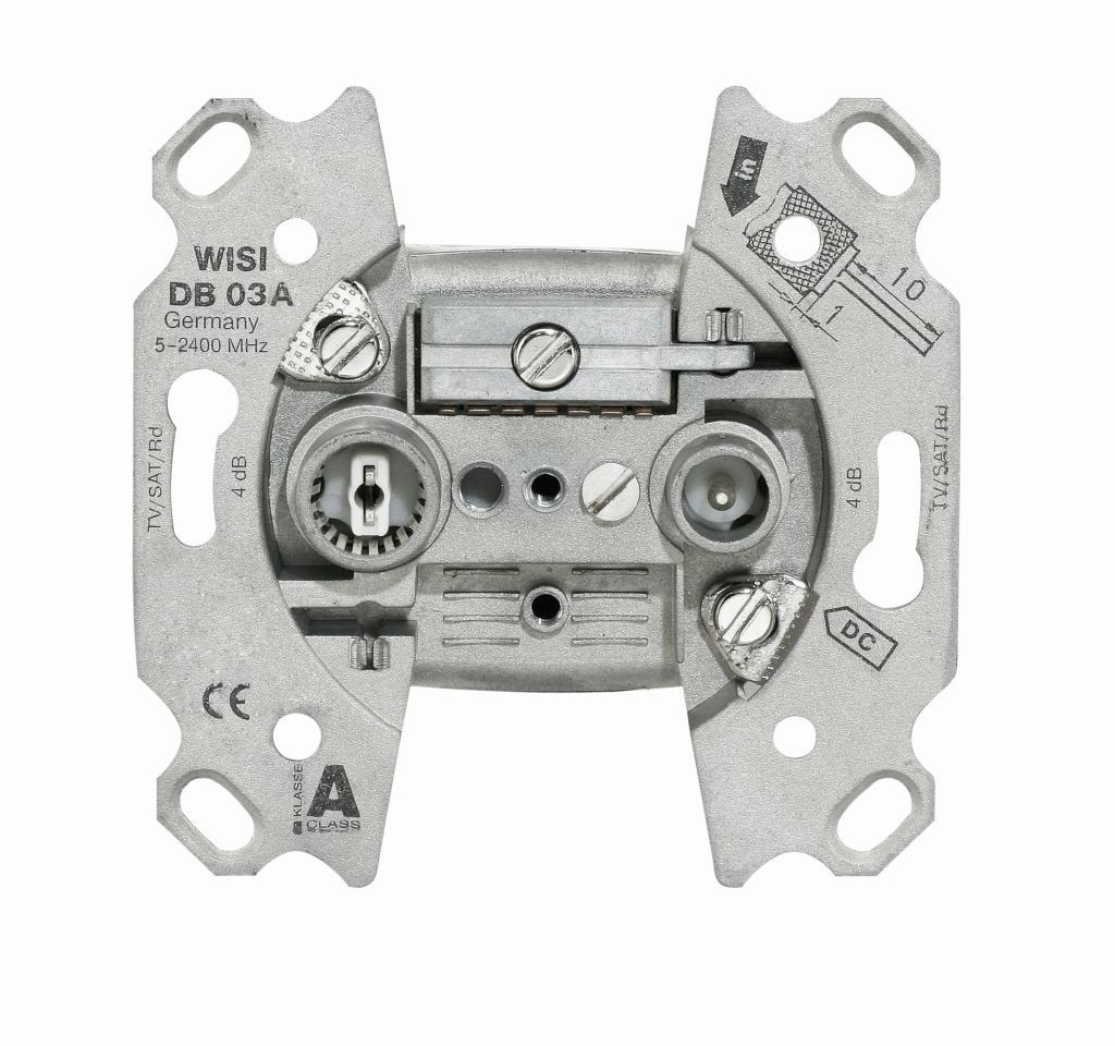 Universal 2-Loch Enddose mit breitbandigem Frequenzbereich von 5-2400 MHz. Somit kann die DB 03 Antennendose sowohl in BK-Applikationen inklusive Rueckkanal als auch in SAT- Verteilanlagen genutzt werden. Zum Anschluss der Endgeraete stehen 2 IEC-Anschluesse zur Verfuegung. Die hohe Entkopplung der Teilnehmerausgaenge stellt den einwandfreien Betrieb der angeschlossenen Endgeraete sicher. Das Schirmungsmaß der Klasse A wird erreicht.