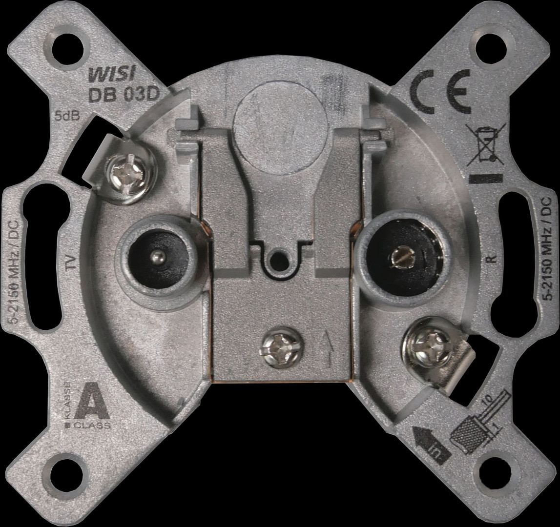 Universal 2-Loch Stichdose mit breitbandigem Frequenzbereich von 5…2150 MHz. Somit kann die DB 03 D Antennendose sowohl in BK-Applikationen inklusive Rückkanal als auch in SAT- Verteilanlagen genutzt werden. Zum Anschluss der Endgeräte stehen 2 IEC-Anschlüsse zur Verfügung. Die hohe Entkopplung der Teilnehmerausgänge stellt den einwandfreien Betrieb der angeschlossenen Endgeräte sicher. Das Schirmungsmaß der Klasse A wird erreicht.