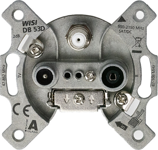 Die DB 53D ist eine 3-Loch Stichdose für den getrennten Anschluss von Satelliten Receiver, terrestrische TV-Geräte und Radioempfänger. Der SAT Anschluss ist mit einem DC-Spannungsdurchgang ausgestattet, der somit die Übertragung von Versorgungs- und Schaltspannungen unterstützt. Das Gehäuse ist als Druckguss ausgeführt und gewährleistet neben Robustheit und flacher Ausführung, ein der Klasse A entsprechend hohes Schirmungsmaß. 47...2150 MHz