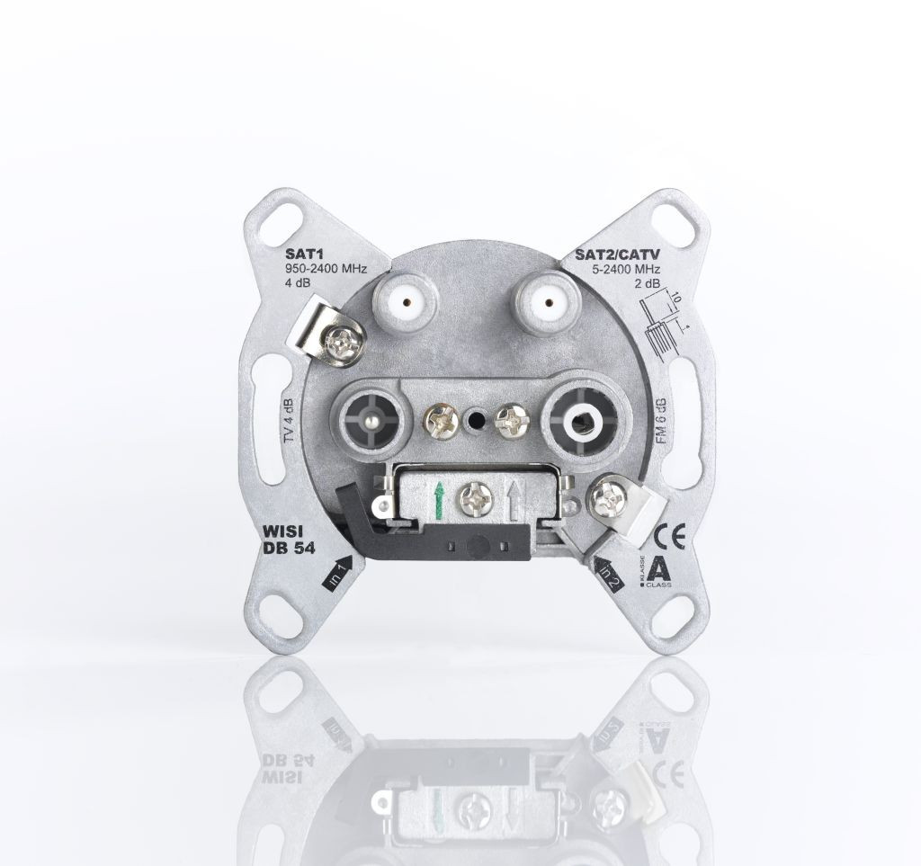 Die DB 54 ist eine 4-Loch Stichdose speziell fuer TWIN Receiver. Dies ermoeglicht 2 Leitungen unabhaengig voneinander zu betreiben. Der SAT 2 Eingang ist auch fuer CATV geeignet. In beiden SAT Anschluessen ist ein DC-Bypass integriert der die Durchleitung der erforderlichen Schaltspannungen ermoeglicht. Das Gehaeuse bietet eine sehr hohe Stabilitaet und gewaehrleistet hohe Schirmungseigenschaften (Klasse A). Dank flacher Bauweise ist sie platzsparend und durch IEC- Buchse/Stecker, 2x F-Buchsen ist ein sicherer Anschluss gewaehrleistet.