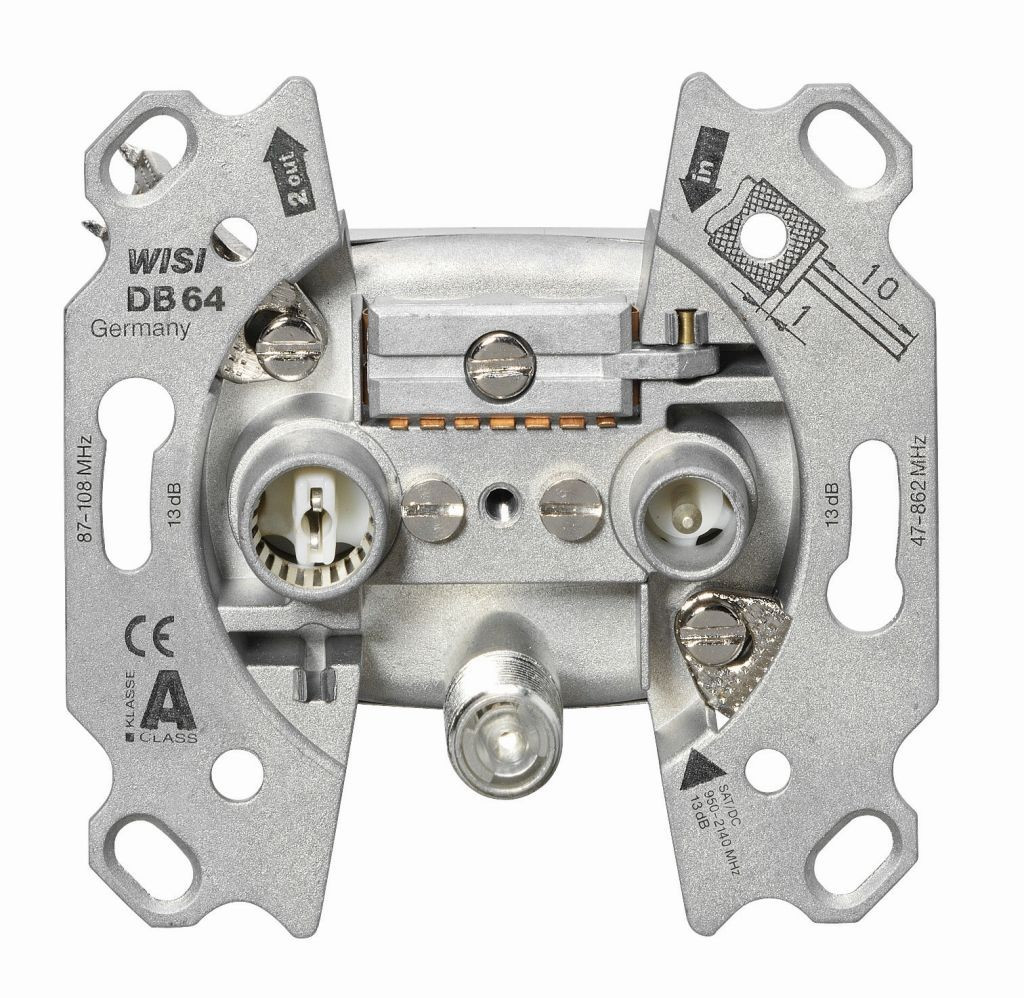 Die DB 64 ist eine 3-Loch Unicable-Durchgangsdose fuer Satellitenempfangsanlagen zum getrennten Anschluss von Radio, TV Empfaengern und zusaetzlichen SAT Empfaengern. Im SAT Anschluss ist ein DC-Bypass integriert der die Durchleitung der erforderlichen Schaltspannungen ermoeglicht. Das Gehaeuse bietet eine sehr hohe Stabilitaet trotz sehr flacher Bauweise. Durch F-und IEC-Buchse,und IEC Stecker ist ein schneller und sicherer Anschluss gewaehrleistet. Wird die DB 64 als Enddose verwendet muss der Abschlusswiderstand DV 27 verwendet werden.