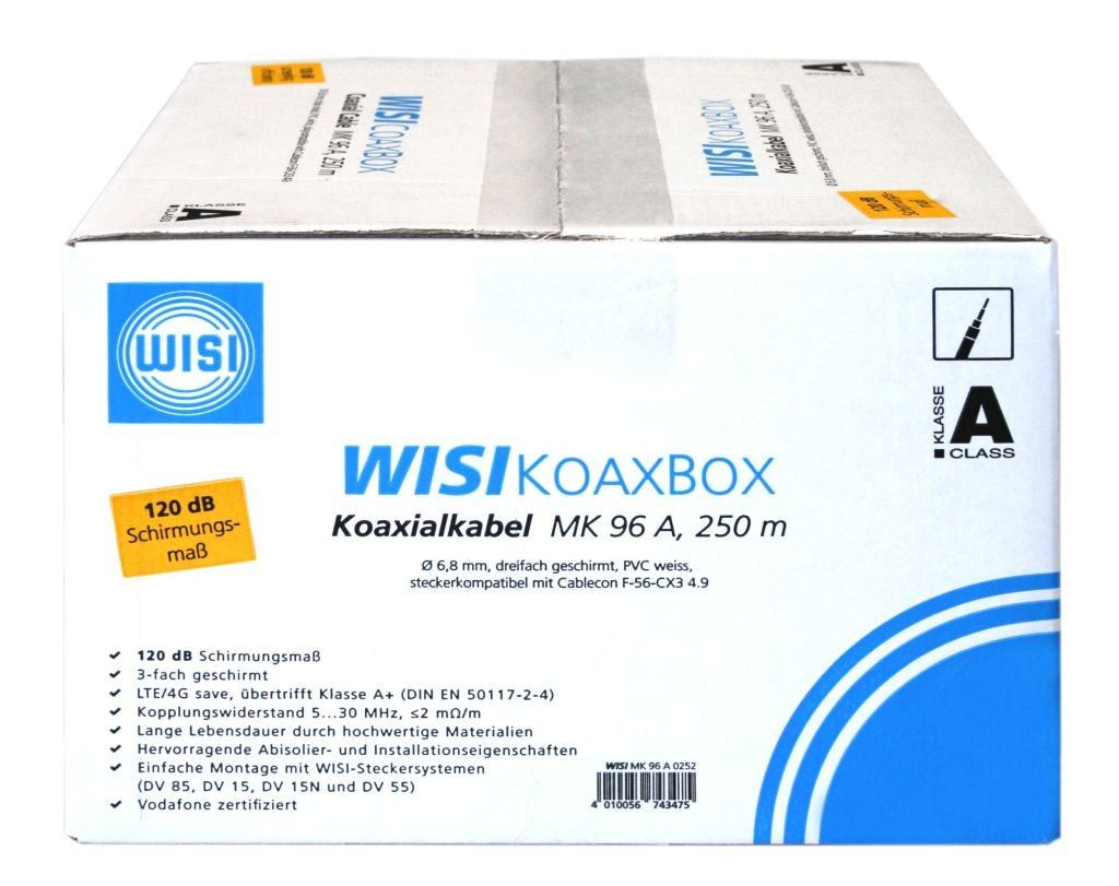 Das hochwertige 3-fach geschirmte Koaxialkabel MK96 A eignet sich mit seinen technischen Spitzenwerten optimal fuer den flexiblen Einsatz bei Sat- und BK-Installationen sowie Terrestrik und Multimedianwendungen. Es uebertrifft die Forderungen der Klasse A+ (DIN EN 50117-2-4) und bietet mit seinem hohen Schirmungsmaß von 120 dB besten Schutz der uebertragenen TV-Signale in allen Einsatzszenarien gegen aeußere Stoereinfluesse. Mit seinen Maßen von 6,8 mm Durchmesser beim PVC Außenmantel eignet sich das MK96 A bestens fuer die passgenaue, einfache Installation mit WISI-Steckersystemen sowie handelsueblichem Verbindungszubehoer. Das MK96 A erfuellt die Euroklasse Dca, s3, d2, a3.