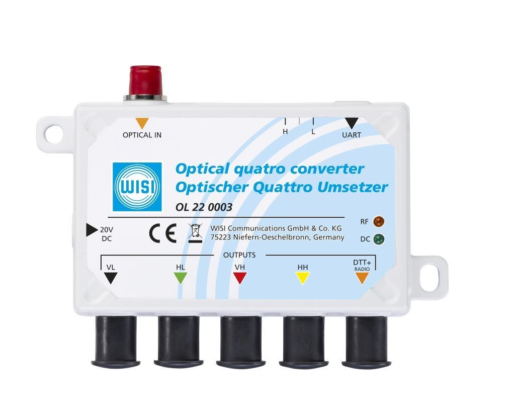 Quattro-Rueckumsetzer zur Wandlung des optischen Eingangsignales in die einzelnen HF-Bereiche: SAT (HH, VH, HL, VL) und terrestrisch. Anwendung bei Multischalter-Anlagen bzw. vor Kopfstellen. Spannungsversorgung ueber nachfolgende Multischalter oder das optionale Netzteil OLPS 0230. Re-Design in kompakter Bauform zu einfacheren Montage.