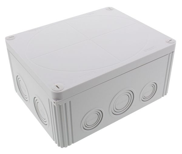 COMBI Feuchtraum-Kabelabzweigkasten aus schwer entflammbaren, halogenfreien, verstärkten Thermoplast. Der Kasten mit hoher Schutzart ist witterungs- und UV-beständig, außerdem schlagfest und bruchsicher. Bestens geeignet bei extremer Beanspruchung oder Installation im Innen- und Außenbereich. Hohe Beständigkeit gegen pflanzliche und tierische Fette, Mineralöl, Diesel, schwache Säuren, schwache und starke Laugen sowie Alkohol. Ausbrechöffnungen seitlich und im Boden, in unterschiedlichen Größen, ermöglichen die Verwendung von Kabeleinführungen mit Kabelverschraubungen und Gegenmuttern. Unverlierbare Schnellverschluss-Deckelschrauben, schließen den Kasten mit nur einer Vierteldrehung. Befestigt wird der Kasten durch innenliegende Öffnungen außerhalb des Dichtbereiches.