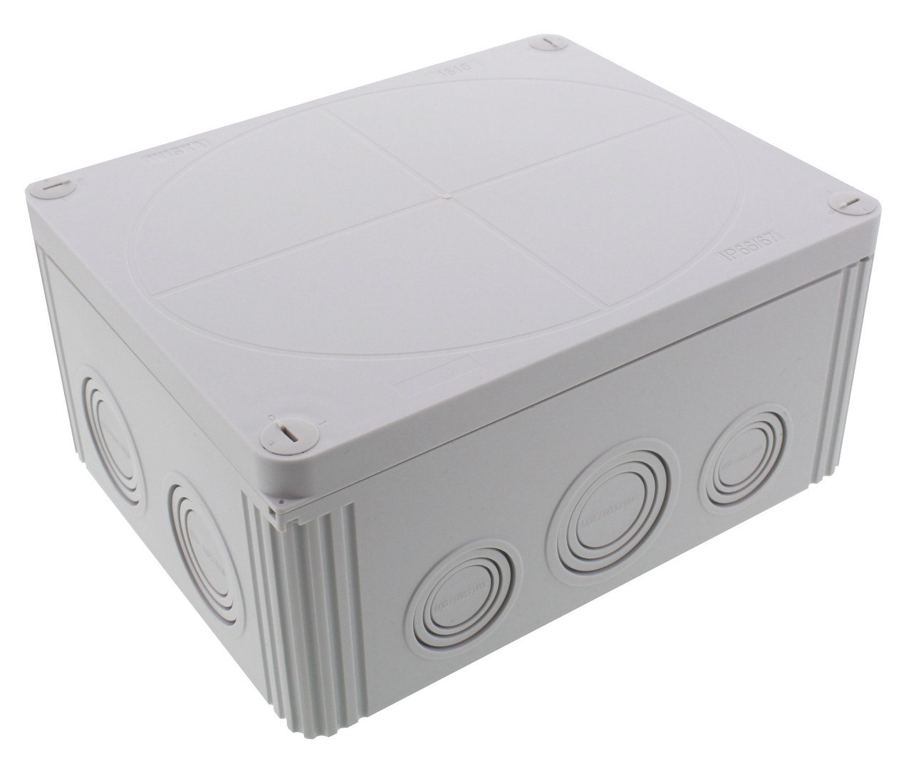 COMBI Feuchtraum-Kabelabzweigkasten aus schwer entflammbaren, halogenfreien, verstärkten Thermoplast, in der 2 Komponenten-Kunststofftechnik kombiniert mit Durchstoßmembranen aus thermoplastischem Elastomer. Der Kasten mit hoher Schutzart ist witterungs- und UV-beständig, außerdem schlagfest und bruchsicher. Bestens geeignet bei extremer Beanspruchung oder Installation im Innen- und Außenbereich. Hohe Beständigkeit gegen pflanzliche und tierische Fette, Mineralöl, Diesel, schwache Säuren, schwache und starke Laugen sowie Alkohol. Dauerhaft elastische, selbstdichtende, seitliche Durchstoßmembranen in patentierter Kombination mit integriertem Gewinde machen sowohl die direkte Kabelmontage durch die Membran als auch den Einsatz von Kabelverschraubungen ohne Gegenmutter möglich. Unverlierbare Schnellverschluss-Deckelschrauben, schließen den Kasten mit nur einer Vierteldrehung. Der Kasten ist bestückt mit WAGO-Klemmen. Befestigt wird der Kasten durch einen Schnellmontagebügel oder innenliegende Öffnungen außerhalb des Dichtbereiches.