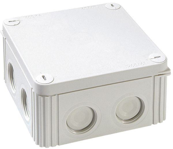 COMBI Feuchtraum-Kabelabzweigkasten aus schwer entflammbaren, halogenfreien, verstärkten Thermoplast, in der 2 Komponenten-Kunststofftechnik kombiniert mit Durchstossmembranen aus thermoplastischem Elastomer. Der Kasten mit hoher Schutzart ist witterungs- und UV-beständig, ausserdem schlagfest und bruchsicher. Bestens geeignet bei extremer Beanspruchung oder Installation im Innen- und Aussenbereich. Hohe Beständigkeit gegen pflanzliche und tierische Fette, Mineralöl, Diesel, schwache Säuren, schwache und starke Laugen sowie Alkohol. Dauerhaft elastische, selbstdichtende, seitliche Durchstossmembranen in patentierter Kombination mit integriertem Gewinde machen sowohl die direkte Kabelmontage durch die Membran als auch den Einsatz von Kabelverschraubungen ohne Gegenmutter möglich. Unverlierbare Schnellverschluss-Deckelschrauben, schliessen den Kasten mit nur einer Vierteldrehung.