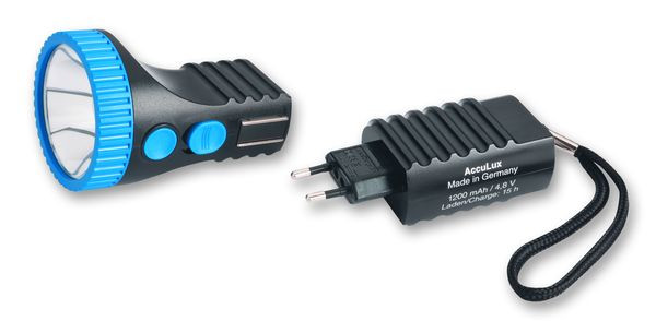 PowerLux LED (Art.Nr. 422083, blau/schwarz)3W-LED-Handleuchte Made in Germany; wechselbares Ladeteil, extrem hell und vorfokussiert mit dennoch breiter Ausleuchtung, (Version LED L: mit Linse für breite Lichtstreuung in der Mitte); kein Glühlampenwechsel mehr, Haftmagnet und Trageschlaufe, NiMH-Akkus: kein Memory-Effekt, relativ kompakt und leicht; Maße 175x70x70 mm, Leuchtmittel: 3 W LED (ca. 200 Lumen!)