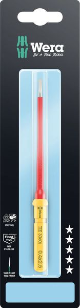VDE Edelstahl-Wechselklinge für Kraftform Kompakt Griff-/Wechselklingensystem. Blitzschneller Austausch der Klinge ohne Sonderwerkzeug. Stückgeprüfte Werkzeuge gem. IEC 60900. Stückprüfung bei 10.000 V für sicheres Arbeiten bei der zugelassenen Spannung von 1.000 V. Die Edelstahlwerkzeuge von Wera sind vakuumeisgehärtet und verfügen damit über die für Verschraubungen benötigten Härten und Festigkeitswerte. Der industrielle Einsatz ist ohne Einschränkungen möglich. Mit Werkzeugfinder Take it easy: Farbkennzeichnung nach Profilen sowie aufgelaserter Größenangabe. Der Sechskantabrollschutz verhindert das unbeabsichtigte Wegrollen der Klinge.