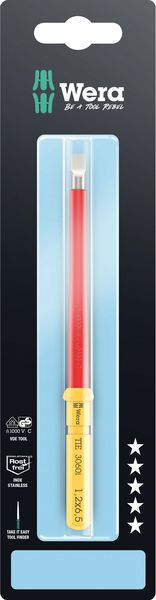 VDE Edelstahl-Wechselklinge für Kraftform Kompakt Griff-/Wechselklingensystem. Blitzschneller Austausch der Klinge ohne Sonderwerkzeug. Stückgeprüfte Werkzeuge gem. IEC 60900. Stückprüfung bei 10.000 V für sicheres Arbeiten bei der zugelassenen Spannung von 1.000 V. Die Edelstahlwerkzeuge von Wera sind vakuumeisgehärtet und verfügen damit über die für Verschraubungen benötigten Härten und Festigkeitswerte. Der industrielle Einsatz ist ohne Einschränkungen möglich. Mit Werkzeugfinder Take it easy: Farbkennzeichnung nach Profilen sowie aufgelaserter Größenangabe. Der Sechskantabrollschutz verhindert das unbeabsichtigte Wegrollen der Klinge.