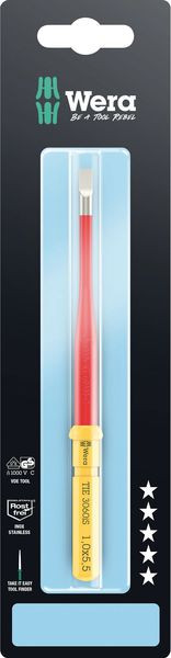 VDE Edelstahl-Wechselklinge für Kraftform Kompakt Griff-/Wechselklingensystem. Blitzschneller Austausch der Klinge ohne Sonderwerkzeug. Stückgeprüfte Werkzeuge gem. IEC 60900. Stückprüfung bei 10.000 V für sicheres Arbeiten bei der zugelassenen Spannung von 1.000 V. Reduzierter Klingendurchmesser mit integrierter Schutzisolation, so können tiefliegende Schraub- und Federelemente erreicht und betätigt werden. Die Edelstahlwerkzeuge von Wera sind vakuumeisgehärtet und verfügen damit über die für Verschraubungen benötigten Härten und Festigkeitswerte. Der industrielle Einsatz ist ohne Einschränkungen möglich. Mit Werkzeugfinder Take it easy: Farbkennzeichnung nach Profilen sowie aufgelaserter Größenangabe. Der Sechskantabrollschutz verhindert das unbeabsichtigte Wegrollen der Klinge.