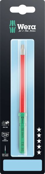 VDE Edelstahl-Wechselklinge für Kraftform Kompakt Griff-/Wechselklingensystem. Blitzschneller Austausch der Klinge ohne Sonderwerkzeug. Stückgeprüfte Werkzeuge gem. IEC 60900. Stückprüfung bei 10.000 V für sicheres Arbeiten bei der zugelassenen Spannung von 1.000 V. Die Edelstahlwerkzeuge von Wera sind vakuumeisgehärtet und verfügen damit über die für Verschraubungen benötigten Härten und Festigkeitswerte. Der industrielle Einsatz ist ohne Einschränkungen möglich. Mit Werkzeugfinder Take it easy: Farbkennzeichnung nach Profilen sowie aufgelaserter Größenangabe. Der Sechskantabrollschutz verhindert das unbeabsichtigte Wegrollen der Klinge.