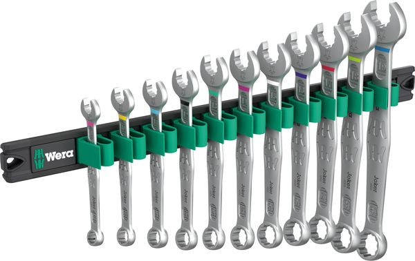 Ringmaulschlüssel-Set, 11-teilig, metrische Größen; auf Klemmleiste. Der Joker 6003 erzielt durch die Kombination des um 7,5° geschwenkten Mauls und der Doppelsechskantgeometrie eine Verdopplung der Ansetzpunkte. Bei einer wiederholten 180°-Drehung des Schlüssels um die Längsachse während des Schraubens gibt es vier Ansetzmöglichkeiten und Muttern bzw. Schraubenköpfe können alle 15° "gepackt" werden. Dadurch wird das Verschrauben besonders in engen Bauräumen deutlich einfacher. Die schlanke und dennoch robuste Ringseite ist um 15° zur Werkzeugachse abgewinkelt. Durch die hochwertige Oberflächenvergütung wird ein hoher und lang anhaltender Korrosionsschutz erzielt. Mit Werkzeugfinder Take it easy: Farbkennzeichnung nach Größen. Die Klemmen der Leiste sorgen für perfekten Halt der Werkzeuge. Die Leiste hält durch starken Magnet sicher an Metallflächen. Alternativ kann die Leiste auch an eine Wand geschraubt werden.