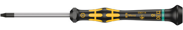 1567 innensechsrund BO ESD Kraftform Micro Schraubendreher mit Bohrung im innensechsrund Profil, TX 8 BO x 60 mmElektrostatisch abgesicherter Micro Schraubendreher. Sicherer Schutz vor elektrostatischer Energie und damit verbundenen Schäden. Durch Abstützen der Hand auf der Drehkappe und durch die Schnelldrehzone unterhalb der Drehkappe ist blitzschnelles Zwirbeln möglich. Zeitintensives Umgreifen entfällt. Kraftzone mit integrierten Weichzonen sorgt für die Übertragung hoher Löse- und Anzugsmomente. Präzisionszone für den richtigen Drehwinkel bei Justierarbeiten. Die Black Point-Spitze bietet Passgenauigkeit und optimierten Korrosionsschutz. Take it easy Werkzeugfinder mit Farbkennzeichnung nach Profilen und Größenstempelung - zum einfachen und schnellen Finden des benötigten Werkzeugs. 05030114001