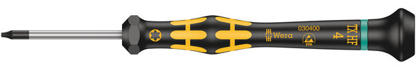 1567 innensechsrund HF ESD Kraftform Micro Schraubendreher mit Haltefunktion, TX 4 x 40 mmElektrostatisch abgesicherter Micro Schraubendreher. Sicherer Schutz vor elektrostatischer Energie und damit verbundenen Schäden. Mit praktischer Haltefunktion: Durch die aus der Flächenpressung zwischen der Abtriebsspitze und Schraubenprofil resultierende Klemmkraft werden die Schrauben sicher auf dem Werkzeug gehalten. Durch Abstützen der Hand auf der Drehkappe und durch die Schnelldrehzone unterhalb der Drehkappe ist blitzschnelles Zwirbeln möglich. Zeitintensives Umgreifen entfällt. Kraftzone mit integrierten Weichzonen sorgt für die Übertragung hoher Löse- und Anzugsmomente. Präzisionszone für den richtigen Drehwinkel bei Justierarbeiten. Die Black Point-Spitze bietet Passgenauigkeit und optimierten Korrosionsschutz. Take it easy Werkzeugfinder mit Farbkennzeichnung nach Profilen und Größenstempelung - zum einfachen und schnellen Finden des benötigten Werkzeugs. 05030400001