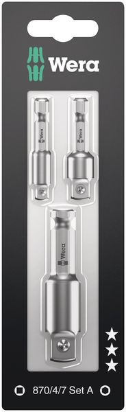 Werkzeugschaftset mit Außenvierkantabtrieb von Wera. Für maschinenbetätigte Steckschlüsseleinsätze. Antrieb: 1/4" Sechskant.
