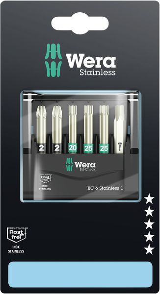 Bit-Check 6 Stainless 1 SB, 6-teilig 2x 3855/4 Bits, Edelstahl: PZ 2 x 50 mm 3x 3867/4 innensechsrund Bits, Edelstahl: TX 20x50 mm, 2x TX 25x50 mm 1x 3840/4 Bits, Edelstahl: 5,5 x 50 mmAufstellbarer Bit-Check mit Hochwertige Bits aus Edelstahl. Wera Edelstahl Werkzeuge werden aus Edelstahl gefertigt, wodurch der unansehnliche Fremdrost vermieden wird. 1/4"-Sechskant, passend für Halter nach DIN ISO-F 6,3. 05073634001