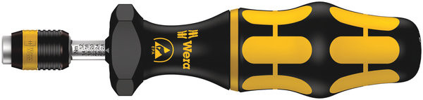 Wera Drehmomentschraubendreher. Sicherer Schutz vor elektrostatischer Energie und damit verbundenen Schäden. Variable Drehmomenteinstellung bei höchster Genauigkeit. Einfache Einstellung des benötigten Drehmomentwertes ohne Sonderwerkzeug. Gute Ablesbarkeit des Skalenwerts. Rapidaptor-Schnellwechseltechnologie für blitzschnellen Bit-Wechsel. Unbegrenztes Lösemoment zum Lösen festsitzender Schrauben. Mehrkomponentiger Kraftform-Griff mit Hart- und Weichzonen für hohe Arbeitsgeschwindigkeiten und zur Schonung der Handfläche. Geeignet für Bits mit 1/4"-Außensechskantantrieb nach DIN ISO 1173-C 6,3 und E 6,3 (ISO 1173).