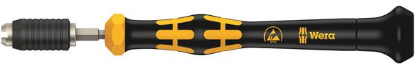 Mit nach Kundenwunsch werkseitig fest voreingestelltem Drehmoment.Kompaktes Griff-/Wechselklingen-System für drehmomentkontrollierte Feinverschraubungen. Der Kraftform Micro ESD Drehmomentschraubendreher ist ideal für drehmomentkontrolliertes Verschrauben an elektrostatisch gefährdeten Bauteilen. Geeignet für die Aufnahme von Bits mit 4 mm Halfmoon-Antrieb (Wera Reihe 9) und Bits mit 4 mm HIOS-Antrieb (Wera Reihe 21). Manipulationsgeschützt. Deutlich hör- und spürbares Überrasten beim Erreichen des eingestellten Drehmomentes. Wiederholgenauigkeit ist zu 100% sichergestellt Unbegrenztes manuelles Lösemoment. Elektrischer Oberflächenwiderstand = 10<sup>9</sup> Ohm zum sicheren Schutz vor elektrostatischer Energie. Gefertigt nach DIN EN 61340-5-1. Griff-/Wechselklingen-System für blitzschnellen Klingenaustausch. Kraftform Micro Griff mit drehbarer Kappe und Schnelldrehzone für blitzschnelles Zwirbeln, kein zeitintensives Umgreifen mehr nötig. Kraftzone mit integrierten Weichzonen zur Übertragung hoher Löse- und Anzugsmomente. Präzisionszone direkt über der Klinge für den richtigen Drehwinkel bei Justierarbeiten. Blitzschnelle Bit-Fixierung: Bit einfach in die Aufnahme schieben, selbsttätige Verriegelung, sicherer Sitz. Zum Bitwechsel Hülse einfach nach vorne schieben und Bit entnehmen. Freilaufende Betätigungshülse zur einfachen Führung des Werkzeugs während des Schraubvorgangs. Bits geeignet für hand- und maschinenbetätigte Verschraubungen mit Elektroschraubern (u. a. HIOS, Delvo, Sehan). Einsatz z.B. an Smartphones, Mobiltelefonen, Kameras, Elektronikgeräten, in Dentallaboratorien und Zahnarztpraxen.<br>Bitte beachten: 1 Ncm = 0,01 Nm.