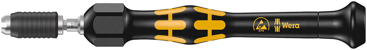 Drehmomentwerkzeug mit einstellbarem Drehmoment von 2,0 bis 11,0 Ncm (Präzision ± 10%). Kompaktes Griff-/Wechselklingen-System für drehmomentkontrollierte Feinverschraubungen. Der Kraftform Micro ESD Drehmomentschraubendreher ist ideal für drehmomentkontrolliertes Verschrauben an elektrostatisch gefährdeten Bauteilen. Geeignet für die Aufnahme von Bits mit 4 mm Halfmoon-Antrieb (Wera Reihe 9) und Bits mit 4 mm HIOS-Antrieb (Wera Reihe 21). Manipulationsgeschützt. Deutlich hör- und spürbares Überrasten beim Erreichen des eingestellten Drehmomentes. Unbegrenztes manuelles Lösemoment. Elektrischer Oberflächenwiderstand = 10<sup>9</sup> Ohm zum sicheren Schutz vor elektrostatischer Energie. Gefertigt nach DIN EN 61340-5-1. Griff-/Wechselklingen-System für blitzschnellen Klingenaustausch. Kraftform Micro Griff mit drehbarer Kappe und Schnelldrehzone für blitzschnelles Zwirbeln, kein zeitintensives Umgreifen mehr nötig. Kraftzone mit integrierten Weichzonen zur Übertragung hoher Löse- und Anzugsmomente. Präzisionszone direkt über der Klinge für den richtigen Drehwinkel bei Justierarbeiten. Blitzschnelle Bit-Fixierung: Bit einfach in die Aufnahme schieben, selbsttätige Verriegelung, sicherer Sitz. Zum Bitwechsel Hülse einfach nach vorne schieben und Bit entnehmen. Freilaufende Betätigungshülse zur einfachen Führung des Werkzeugs während des Schraubvorgangs. Bits geeignet für hand- und maschinenbetätigte Verschraubungen mit Elektroschraubern (u. a. HIOS, Delvo, Sehan). Einsatz z.B. an Smartphones, Mobiltelefonen, Kameras, Elektronikgeräten, in Dentallaboratorien und Zahnarztpraxen.
