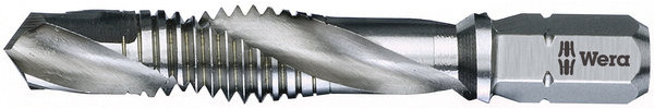 Hochwertiger Kombigewindebohrer zum Bohren, Gewindeschneiden und Entgraten. Aus Hochleistungsschnell-Stahl (HSS). Fein abgestimmte Material-Elastizität sorgt für hohe Standzeiten. Sehr gute Zentriereigenschaften, einwandfreie Spanabfuhr und geringe Verkantungsgefahr garantieren angenehmes Arbeiten. Sehr gute Kraftübertragung durch Sechskant-Schaft. Antrieb: 1/4"-Sechskant, passend für Halter mit Aufnahme nach DIN ISO 1173-D 6,3.