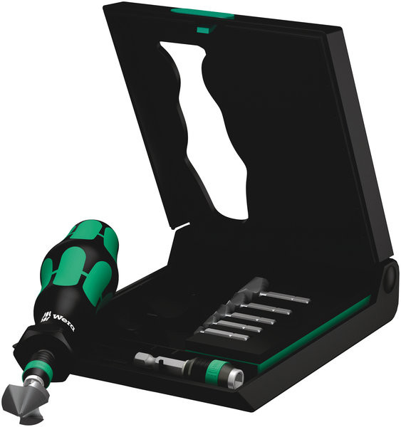 8-teiliger Kegelsenkerbit-Satz in stabiler Kunststoffbox zum Entgraten, Fasen und Senken. Die feinabgestimmte Materialelastizität garantiert hohe Standzeiten. Einwandfreie Spanabfuhr und geringe Verkantungsgefahr gewährleisten angenehmes Arbeiten. Schneidenteil nach DIN 335-C, 90° mit 3 Schneiden. Mit hochwertigem, ergonomischen und mit Magnet ausgestatteten Bit-Handhalter. Das Schnellwechselfutter Rapidaptor gewährleistet blitzschnellen Bitwechsel ohne Hilfswerkzeug. 1/4"-Sechskant passend für Halter mit Aufnahme nach DIN ISO 1173-D 6,3.