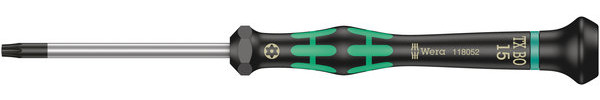 2067 Elektronik innensechsrund BO Schraubendreher, TX 15 x 60 mm Hochwertiger Wera Micro Schraubendreher für feinmechanische Verschraubungen. Für innensechsrund Sicherheitsverschraubungen: innensechsrund BO Schrauben besitzen in ihrem Antriebsprofil einen vorstehenden Zapfen. Damit wird unerlaubtes Lösen verhindert, denn mit "normalen" innensechsrund Werkzeugen können diese Schrauben nicht betätigt werden. Nur spezielle innensechsrund BO Werkzeuge weisen eine Bohrung auf, in die der Zapfen aufgenommen wird. Durch Abstützen der Hand auf der Drehkappe und durch die Schnelldrehzone unterhalb der Drehkappe ist blitzschnelles Zwirbeln möglich. Zeitintensives Umgreifen entfällt. Kraftzone mit integrierten Weichzonen sorgt für die Übertragung hoher Löse- und Anzugsmomente. Präzisionszone für den richtigen Drehwinkel bei Justierarbeiten. Die Wera Black Point-Spitze bietet Passgenauigkeit und optimierten Korrosionsschutz. Take it easy Werkzeugfinder mit Farbkennzeichnung nach Profilen und Größenstempelung - zum einfachen und schnellen Finden des benötigten Werkzeugs. 05118052001