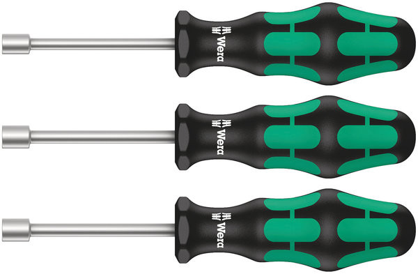 Steckschlüssel-Schraubendreher mit Hohlschaft von Wera. Hohlschaft zur Verschraubung bei Gewindestangen, denn der Hohlschaft nimmt die Gewindestange auch durch die Schraubenmutter hindurch auf. Satzbestückung besonders geeignet für den Ein- und Ausbau von Mischbatterien an Waschtischen. Mehrkomponentiger Kraftform Griff für hohe Arbeitsgeschwindigkeiten und besonders ergonomisches Verschrauben. Kraftform Plus: Harte Griffzonen für hohe Arbeitsgeschwindigkeit, während weiche Griffzonen hohe Drehmomentübertragung garantieren. Mit Sechskantabrollschutz gegen Wegrollen. Mit Griffkennzeichnung zum leichteren Finden und Sortieren des Werkzeugs. Für Außensechskantschrauben.
