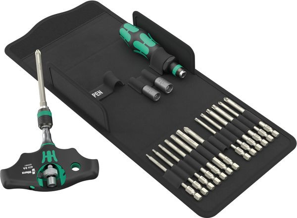 18-teiliger Satz in robuster textiler Box. 1 Quergriff-Bits-Handhalter 416 RA mit Ratschenfunktion und Rapidaptor Schnellwechselfutter für ¼" Bits. Die integrierte Ratsche mit Feinverzahnung (80 Zähne/Rückholwinkel 4,5°) vereinfacht und beschleunigt das Schrauben ohne mühsames Neuansetzen. Die vollständig in den Griff eingebettete Knarrenmechanik sorgt für sehr handliches und angenehmes Arbeiten. Mit Umschalthebel für bequemen Rechts/Links Richtungswechsel in Einhand-Bedienung. Die ergonomische Form des Griffs füllt den Handballen gut aus, die Finger liegen sicher in den weich gerundeten Griffmulden. Die ganze Hand findet Kontakt zum Griff, Reibungsverluste zwischen Hand und Griff werden vermieden. Bithalter für Bits mit 1/4" Außensechskantantrieb nach DIN ISO 1173-C 6,3 und E 6,3. Mit Rapidaptor-Technologie für blitzschnelles Wechseln der Bits. 14 zähharte Bits, ¼", 89 mm lang, für den universellen Einsatz. 2 Steckschlüsseleinsätze in magnetischer Ausführung zum leichteren Ansetzen der Schrauben.
