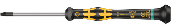 1567 innensechsrund HF ESD Kraftform Micro Schraubendreher mit Haltefunktion, TX 10 x 60 mmElektrostatisch abgesicherter Micro Schraubendreher. Sicherer Schutz vor elektrostatischer Energie und damit verbundenen Schäden. Mit praktischer Haltefunktion: Durch die aus der Flächenpressung zwischen der Abtriebsspitze und Schraubenprofil resultierende Klemmkraft werden die Schrauben sicher auf dem Werkzeug gehalten. Durch Abstützen der Hand auf der Drehkappe und durch die Schnelldrehzone unterhalb der Drehkappe ist blitzschnelles Zwirbeln möglich. Zeitintensives Umgreifen entfällt. Kraftzone mit integrierten Weichzonen sorgt für die Übertragung hoher Löse- und Anzugsmomente. Präzisionszone für den richtigen Drehwinkel bei Justierarbeiten. Die Black Point-Spitze bietet Passgenauigkeit und optimierten Korrosionsschutz. Take it easy Werkzeugfinder mit Farbkennzeichnung nach Profilen und Größenstempelung - zum einfachen und schnellen Finden des benötigten Werkzeugs. 05030406001