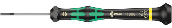 Hochwertiger Wera Micro Schraubendreher für feinmechanische Verschraubungen. Durch Abstützen der Hand auf der Drehkappe und durch die Schnelldrehzone unterhalb der Drehkappe ist blitzschnelles Zwirbeln möglich. Zeitintensives Umgreifen entfällt. Kraftzone mit integrierten Weichzonen sorgt für die Übertragung hoher Löse- und Anzugsmomente. Präzisionszone für den richtigen Drehwinkel bei Justierarbeiten. Die Wera Black Point-Spitze bietet Passgenauigkeit und optimierten Korrosionsschutz. Take it easy Werkzeugfinder mit Farbkennzeichnung nach Profilen und Größenstempelung - zum einfachen und schnellen Finden des benötigten Werkzeugs.