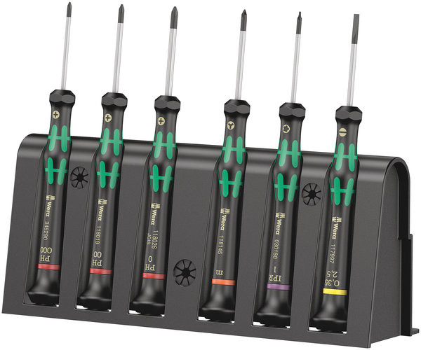 2050/6 Elektronik-Schraubendrehersatz + Rack, 6-teilig 3x 2050 PH Elektronik-Kreuzschlitzschraubendreher: PH 000x40 mm, PH 00x40 mm, PH 0x40 mm 1x 2067 Elektronik IPR innensechsrund PLUS® Schraubendreher: 1 IPR x 40 mm 1x 2072 Kraftform Micro Schraubendreher für Microstix® Schrauben: m x 40 mm 1x 2035 Elektronik-Schlitzschraubendreher: 0,35 x 2,5 x 40 mm Hochwertiger Wera Micro Schraubendrehersatz für feinmechanische Verschraubungen. Durch Abstützen der Hand auf der Drehkappe und durch die Schnelldrehzone unterhalb der Drehkappe ist blitzschnelles Zwirbeln möglich. Zeitintensives Umgreifen entfällt. Kraftzone mit integrierten Weichzonen sorgt für die Übertragung hoher Löse- und Anzugsmomente. Präzisionszone für den richtigen Drehwinkel bei Justierarbeiten. Die Wera Black Point-Spitze bietet Passgenauigkeit und optimierten Korrosionsschutz. Inklusive praktischem Rack zur übersichtlichen Aufbewahrung der Schraubendreher. 05030181001